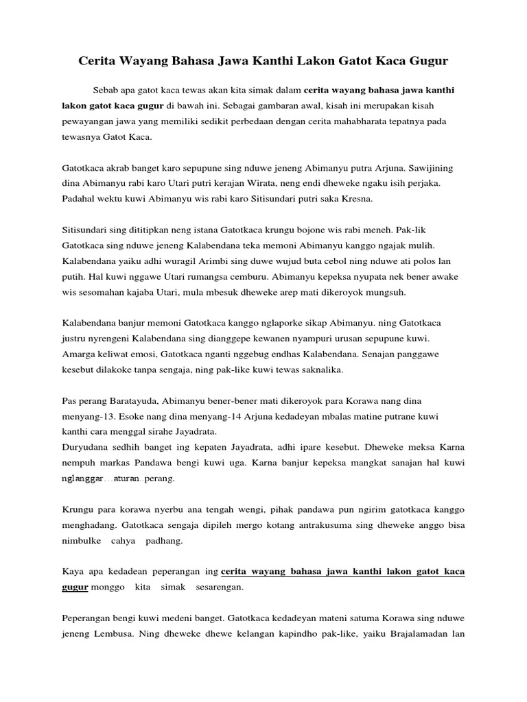 Cerita Wayang Bahasa Jawa Kanthi Lakon Gatot Kaca Gugur Docx